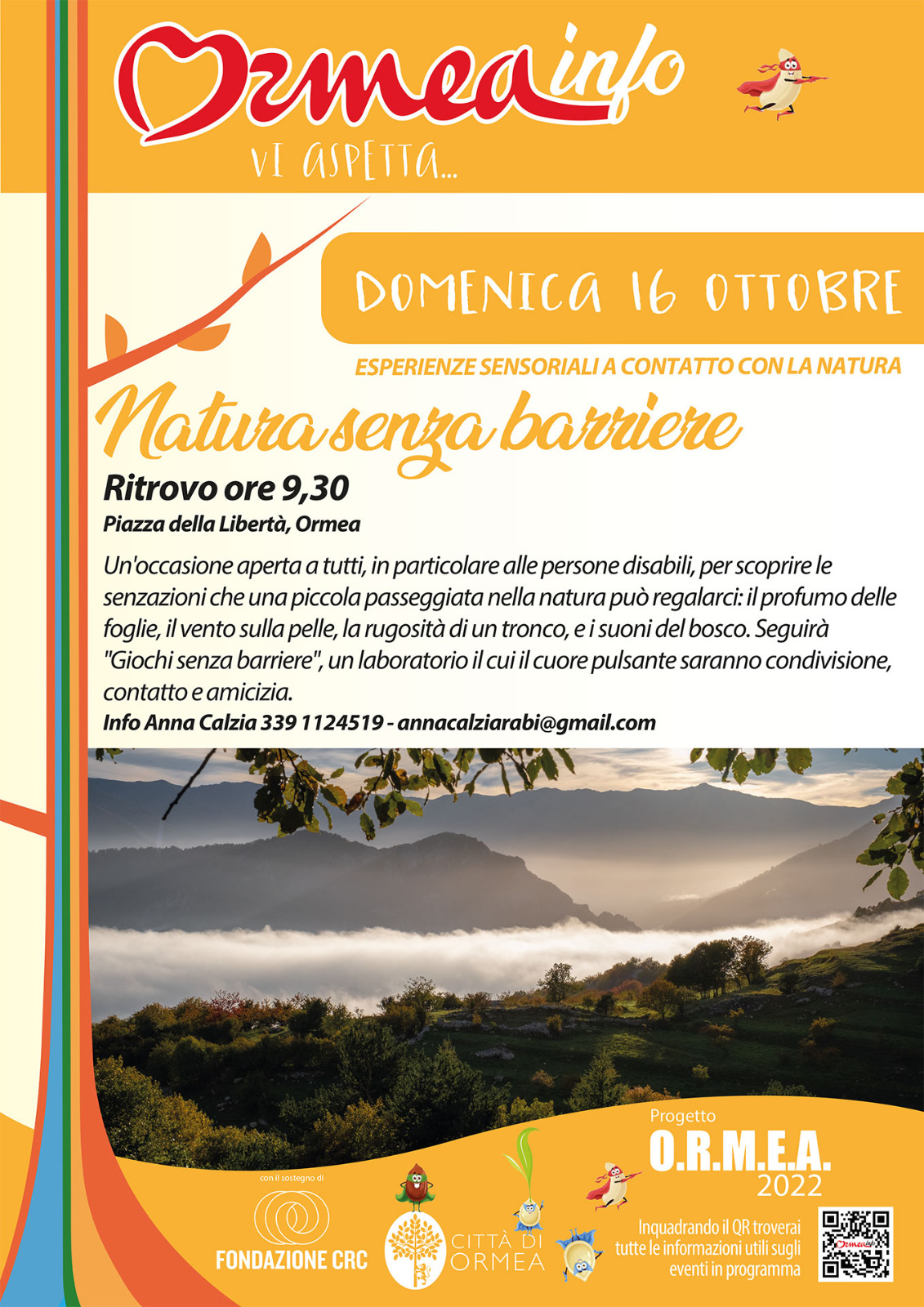 Un'occasione aperta a tutti, in particolare alle persone disabili, per scoprire le sensazioni che una piccola passeggiata nella natura può regalarci: il profumo delle foglie, il vento sulla pelle, la rugosità di un tronco e i suoni del bosco. Seguirà "Giochi senza barriere", un laboratorio in cui il cuore pulsante saranno "condivisione - contatto - amicizia"
