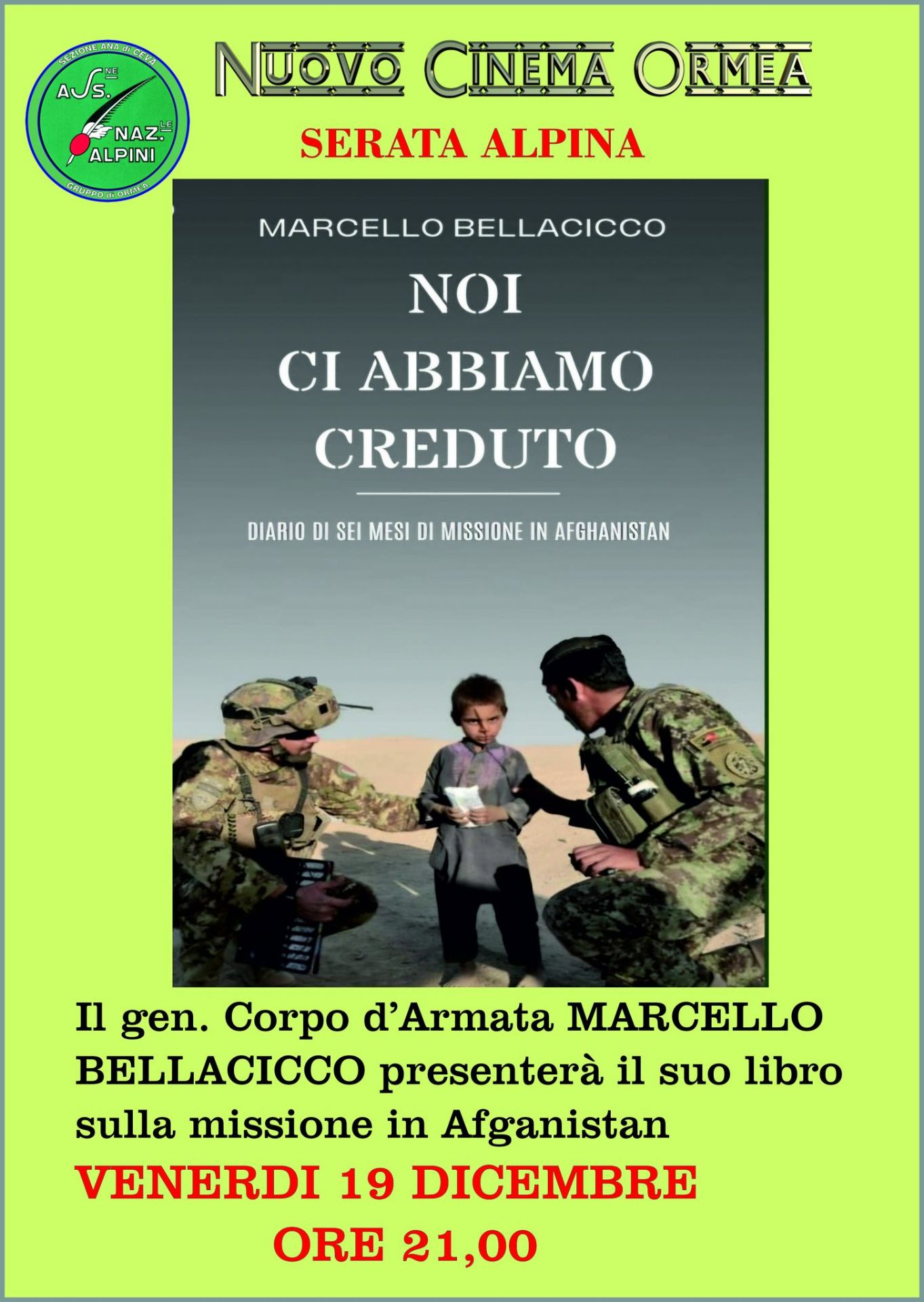 Venerdì 19 dicembre, alle ore 21 presso il Nuovo Cinema Ormea, il gen. Corpo d'Armata Marcello Bellacicco presenterà il suo libro "Noi ci abbiamo creduto", un diario di sei mesi sulla missione in Afganistan, in occasione della serata alpina.