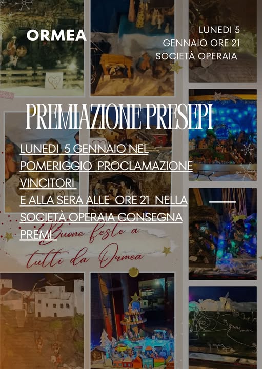 Lunedì 5 gennaio alle ore 21, presso la Sala della Società Operaia , ci sarà la premiazione dei primi tre vincitori del Concorso dei Presepi.