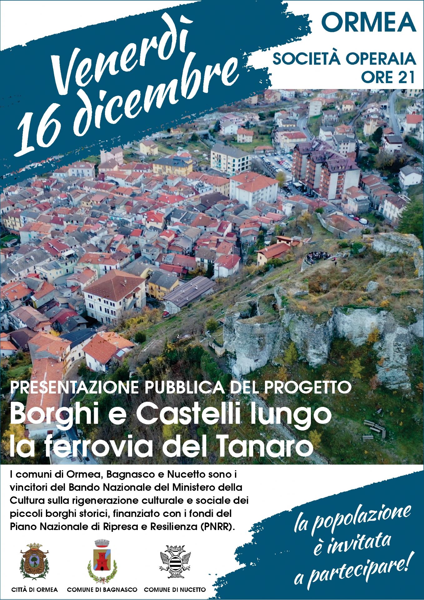 Il 16 Dicembre alle ore 21 nella Società Operaia ci sarà la pubblica presentazione del progetto vincitore del bando Nazionale del Ministero della Cultura sulla rigenerazione culturale e sociale dei piccoli borghi storici, finanziato con i fondi del Piano Nazionale di Ripresa e Resilienza (PNRR). vinto dal Comune di Ormea, assieme a quelli di Nucetto e Bagnasco. Gli esperti ci parleranno delle modalità di svolgimento, tempistiche e partecipazione.