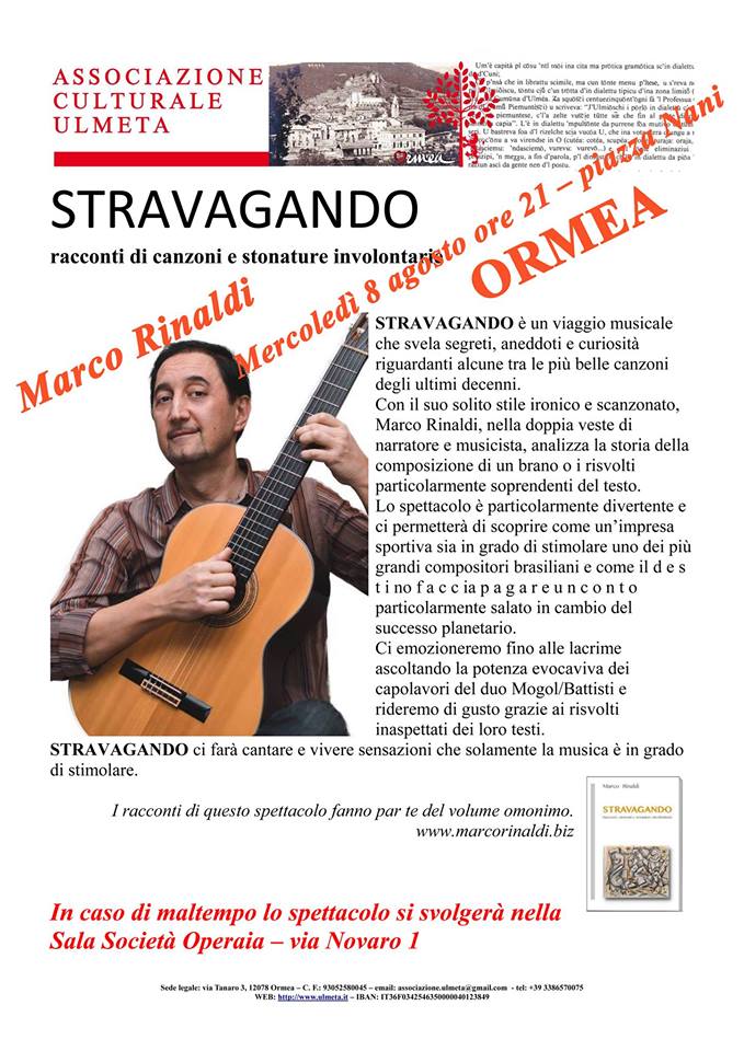 Stravagando è un viaggio musicale che svela segreti, aneddoti e curiosità riguardanti alcune tra le più belle canzoni degli ultimi decenni. Con il suo solito stile ironico e scanzonato, Marco Rinaldi, nella doppia veste di narratore e musicista, analizza la storia della composizione di un brano o i risvolti particolarmente sorprendenti del testo. Lo spettacolo è particolarmente divertente e ci permetterà di scoprire come un'impresa sportiva sia in grado di stimolare uno dei più grandi compositori brasiliani e come il destino faccia pagare un conto particolarmente salato in cambio del successo planetario. Ci emozioneremo fino alle lacrime ascoltando la potenza evocativa dei capolavori del duo Mogol / Battisti e rideremo di gusto grazie ai risvolti inaspettati dei loro testi. Stravagando ci farà cantare e vivere sensazioni che solamente la musica è in grado di stimolare.