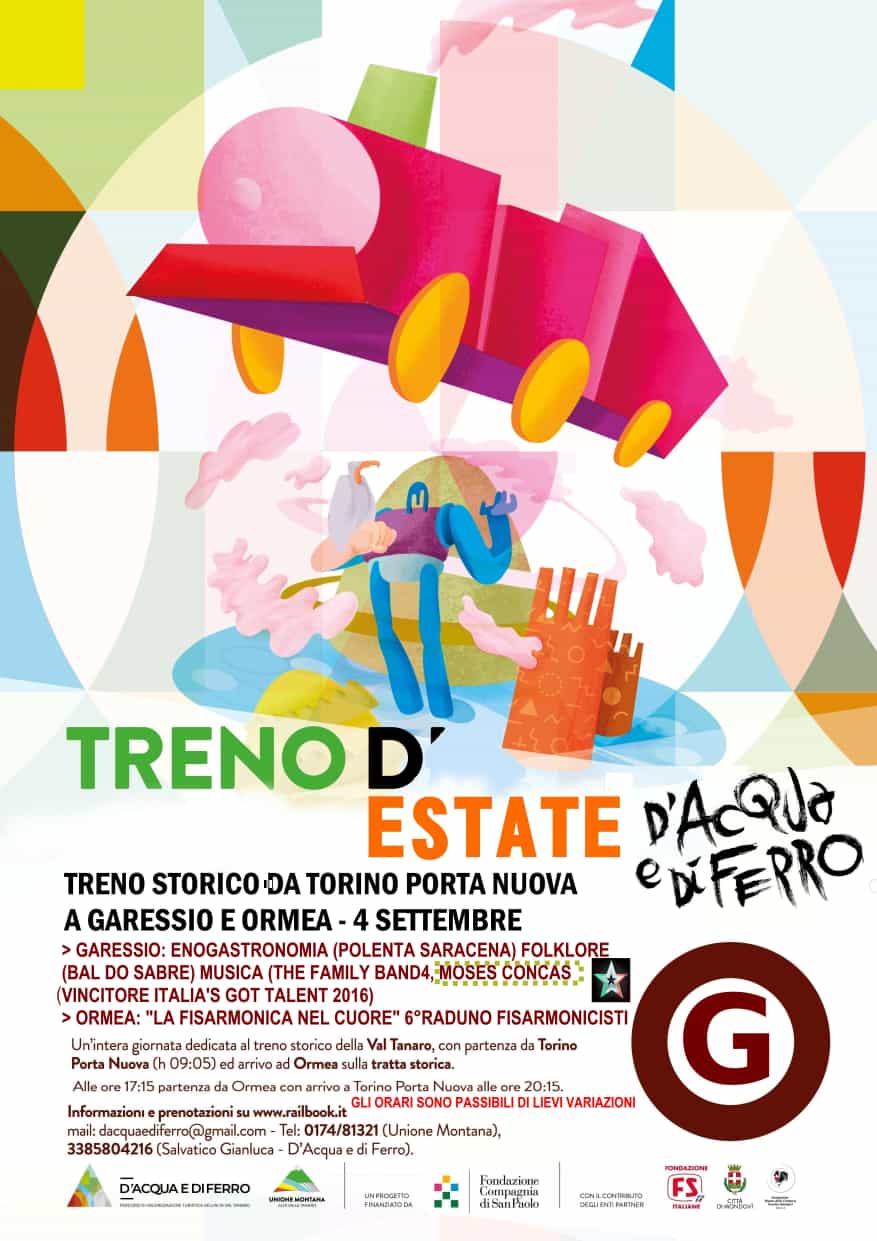 Garessio: il rinomato centro valligiano sarà vivacizzato dal mercatino dell'artigianato e antiquariato; alla discesa dal treno si terrà un'esibizione del Bal do Sabre di Bagnasco e sarà possibile visitare il centro storico medievale (inserito tra i borghi più belli d'Italia) anche a bordo del trenino su gomma che per tutta la giornata effettuerà percorsi panoramici per la cittadina; a Pranzo sarà possibile degustare la Polenta saracena con sugo a base di panna e porri, accompagnata da salsiccia, formaggi, dolci e vino (o bevanda alternativa); Nel pomeriggio si terrà il concerto di Moses Concas (armonicista di fama internazionale) e l'esibizione di alcune scuole di ginnastica locali. Durante tutta la giornata, le strade cittadine risuoneranno della musica di strada della "The Family Band4".